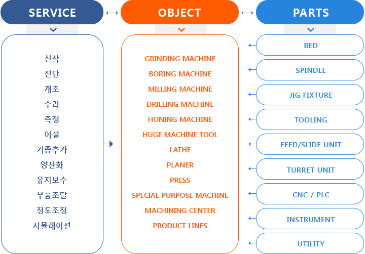(주)제일이앤엠은 아래에 예시한대로, 각종 공작기계 및 산업설비에 최종사용자가 요구하는 여러 종류의 서비스를 수행함이 가능하며, 설비의 총체적 문제 뿐만 아니라 고도의 정밀도와 민감한 부분품에 대한 서비스 역시 가능하며, 이에 파생되는 여러 컨설팅을 수행할 수 있는 역량을 갖추고 있습니다. 귀사의 사용중인 또는 사용예정인 장비에 대한 그 어떤 조치도 당사의 서비스와 함께 만족하실 수 있습니다.